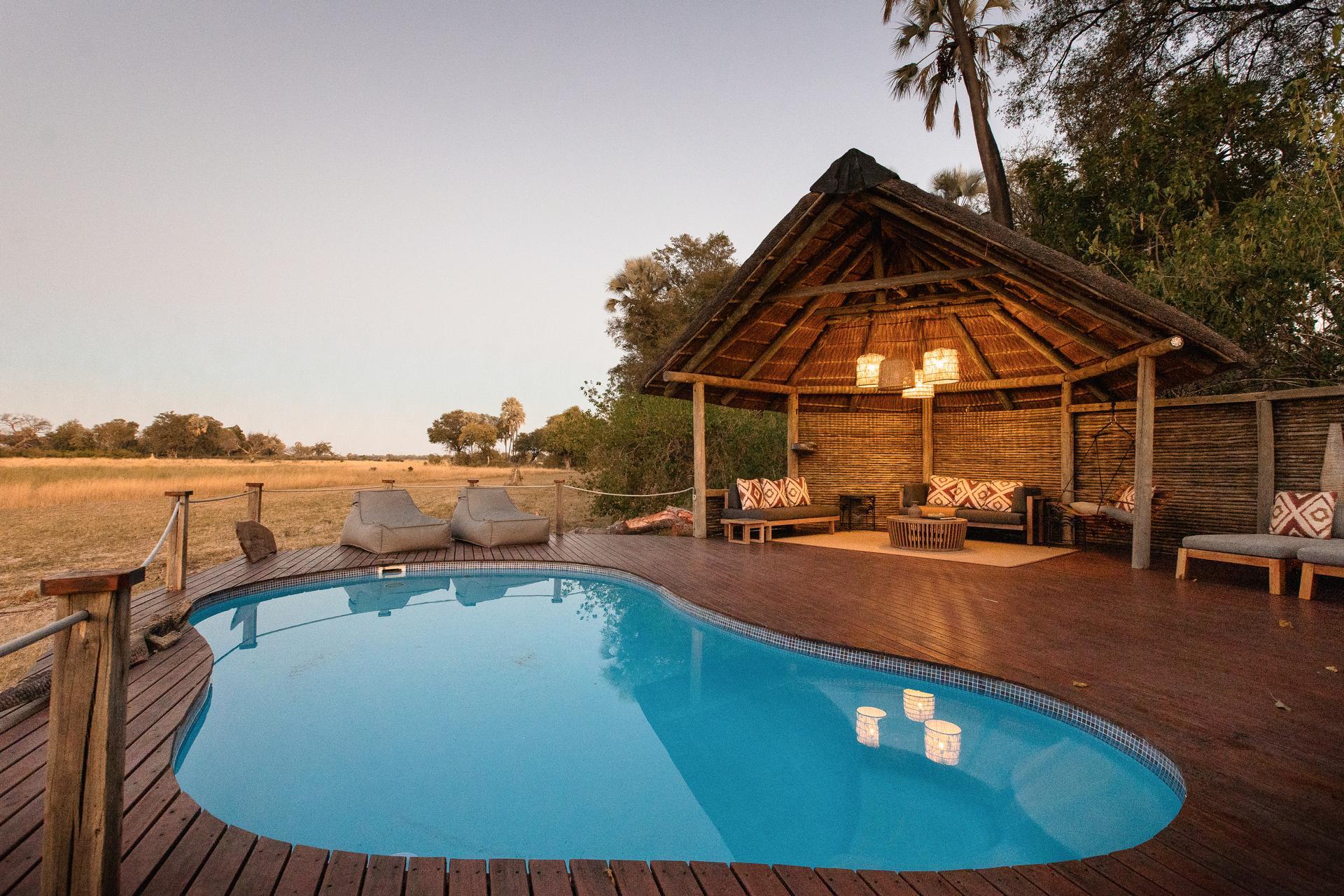 Buchen Sie eine lange Sundowner-Pirschfahrt, um zu verweilen, während Elefanten und Büffel aus dem Busch zum Trinken kommen, fordern Sie Zeit in der Boma neben dem Pool an einem ruhigen Abend an, um Geschichten am Feuer zu erzählen, und falls Hubschrauber fliegen – fügen Sie einen 30–60-minütigen Hubschrauberflug hinzu, um die Kanäle vor Ihrer nächsten Pirschfahrt aus der Vogelperspektive zu sehen.