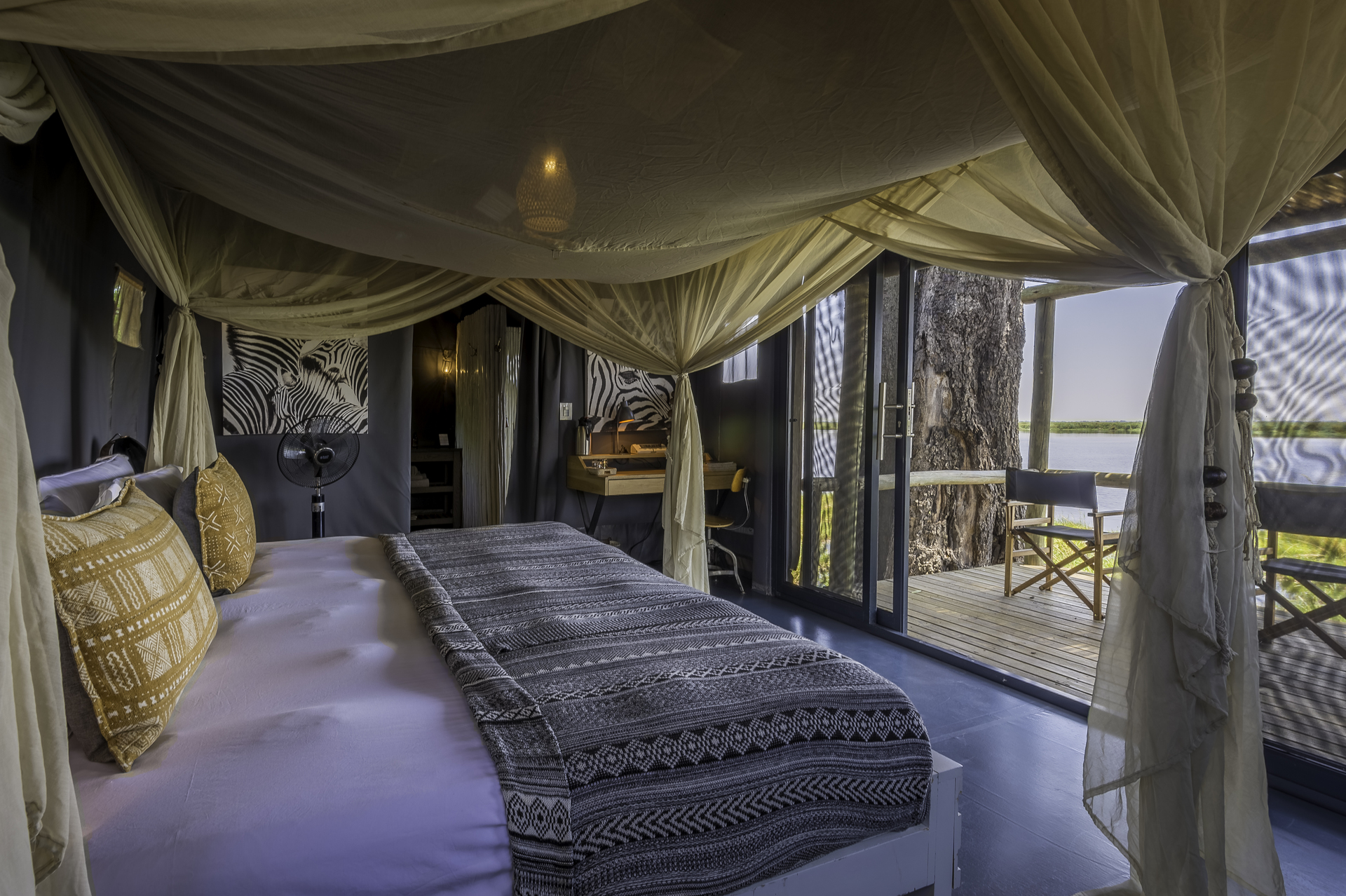 Camp-Stil, großzügig und Feuer-Abende, mit Brunch im Schatten eines großen Feigenbaums, klassisches Botswana-Rindfleisch gegrillt über offener Kohle in der Boma, frisch gebackene Brote und herzhafte Potjie-Eintöpfe, einfache Anrichtung und jede Menge Geschichte-Austausch unter den Sternen.