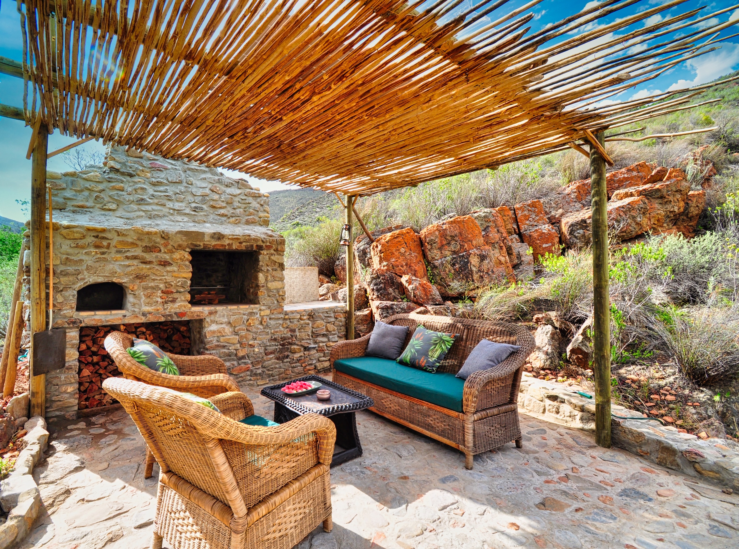 An off-grid, digital detox, design-led mountain hideaway for two (only!) set deep in a Klein Karoo ravine, Leopard’s Kloof is Wolwehoek’s single, ultra-private camp: solar-powered, 4×4/SUV-access only, with a wood-fired hot-tub/plunge pool, pizza oven, braai, and an indoor bath that steps out to an outdoor shower and big valley views.